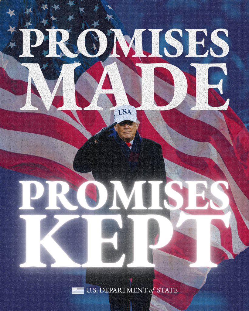 “Në vetëm një vit, Presidenti Trump ka rikthyer sovranitetin amerikan duke ndjekur me guxim paqen përmes forcës. Falë udhëheqjes së tij vendimtare, aleatët tanë na respektojnë, kundërshtarët tanë na frikësohen, dhe populli amerikan vihet në radhë të parë. Premtime të bëra, premtime të mbajtura” – Sekretari i Shtetit Marco Rubio.