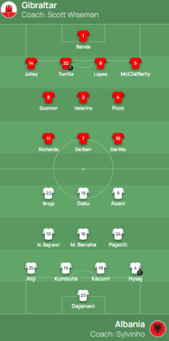 Në portë debuton Dajsinani, ndërsa në mbrojtje është Hysaj, Kacurri, Kumbulla dhe Aliji. Në mesfushë janë vendosur Medon Berisha, Pajaziti dhe Bajrami, ndërsa treshja e sulmit përbëhet nga Broja, Daku dhe Asani.