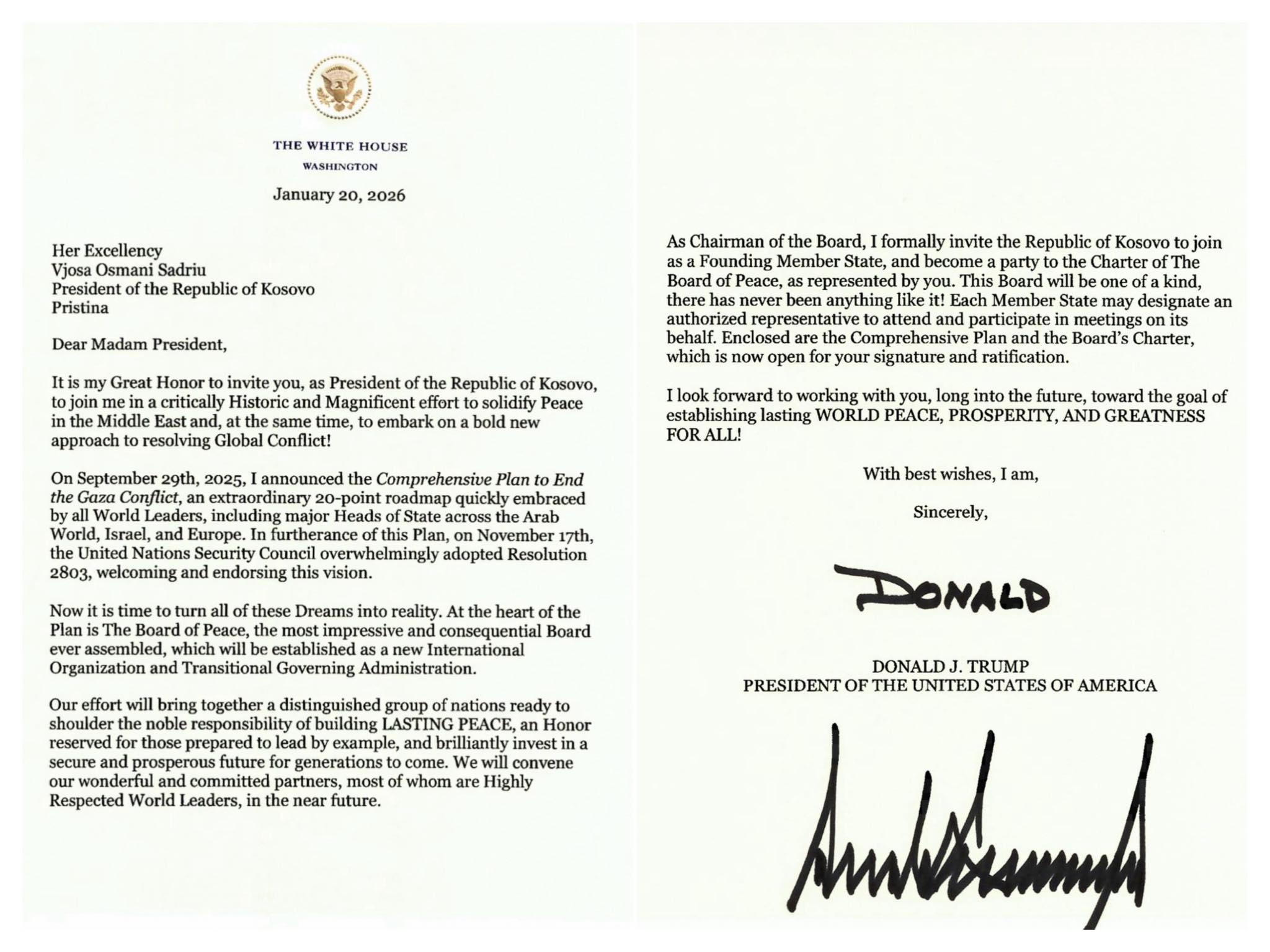 Presidentja e Kosovës, Vjosa Osmani ka marrë ftesë zyrtare nga Donald Trump për të përfaqësuar Kosovën në Bordin e Paqes.